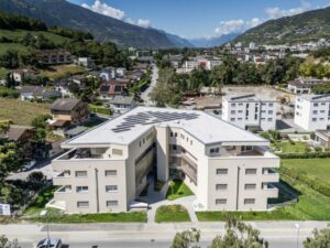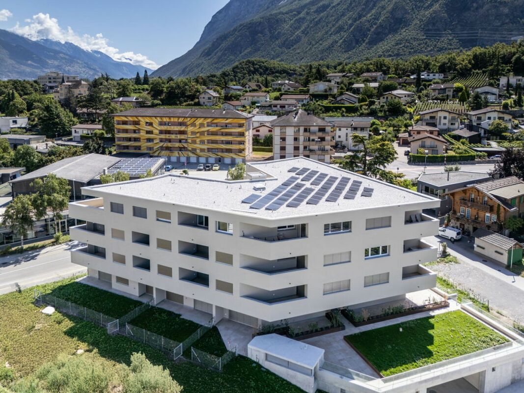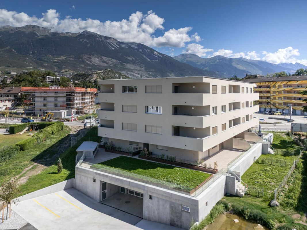 La Résidence "Les Ceps", construite au standard Minergie, se situe au milieu d'un quartier résidentiel calme à quelques centaines de mètres du lac de Géronde et du centre-ville.